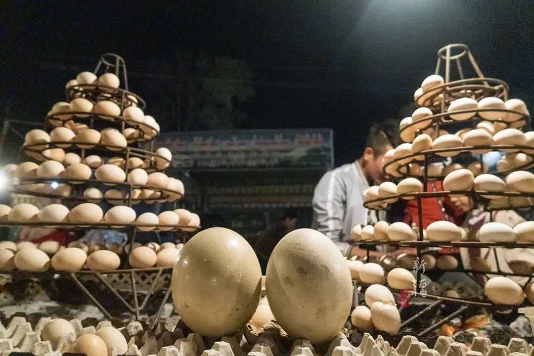 层层叠叠的烤架上整齐地摆放着各种蛋,鸡蛋、鸭蛋不必说,最大的竟然是鸵鸟蛋。因为摆放位置的不同,烤出来的蛋口感也不同。你可以自己和摊主说什么熟度的蛋,蛋黄是流心还是凝固的,摊主自会帮你挑选最合适你的那一颗蛋。