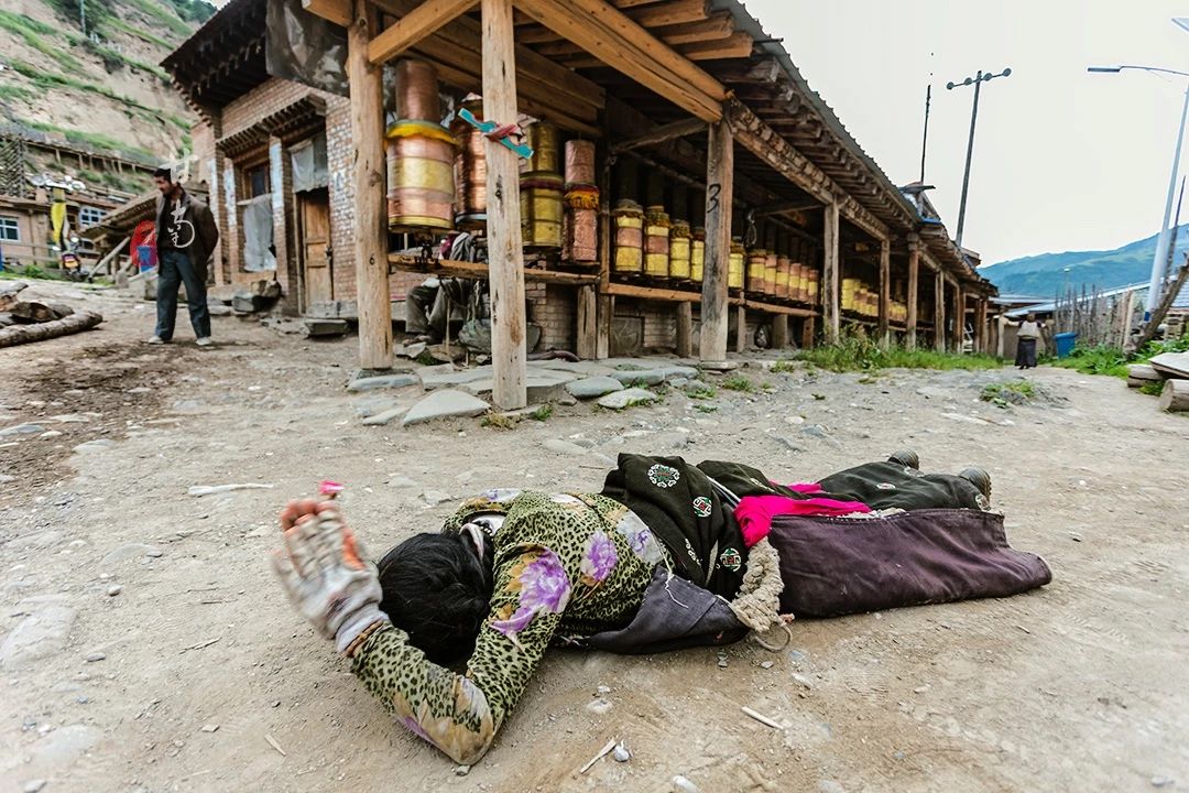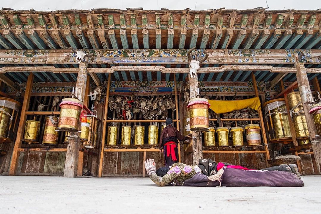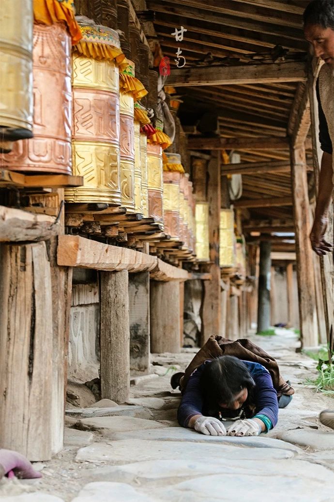 还有些人,以磕长头向神灵表达尊崇之心。也许他的衣衫会被磨破,脸颊会被蹭脏,可他们毫不在意,他们的信仰无坚不摧。