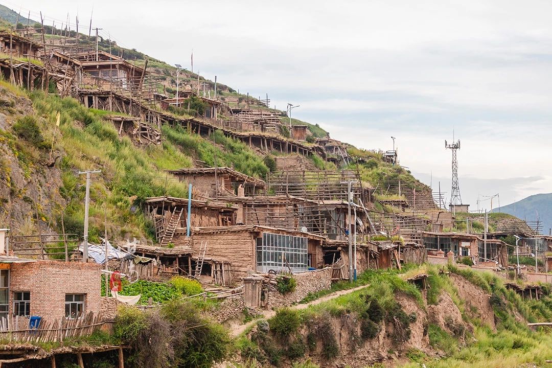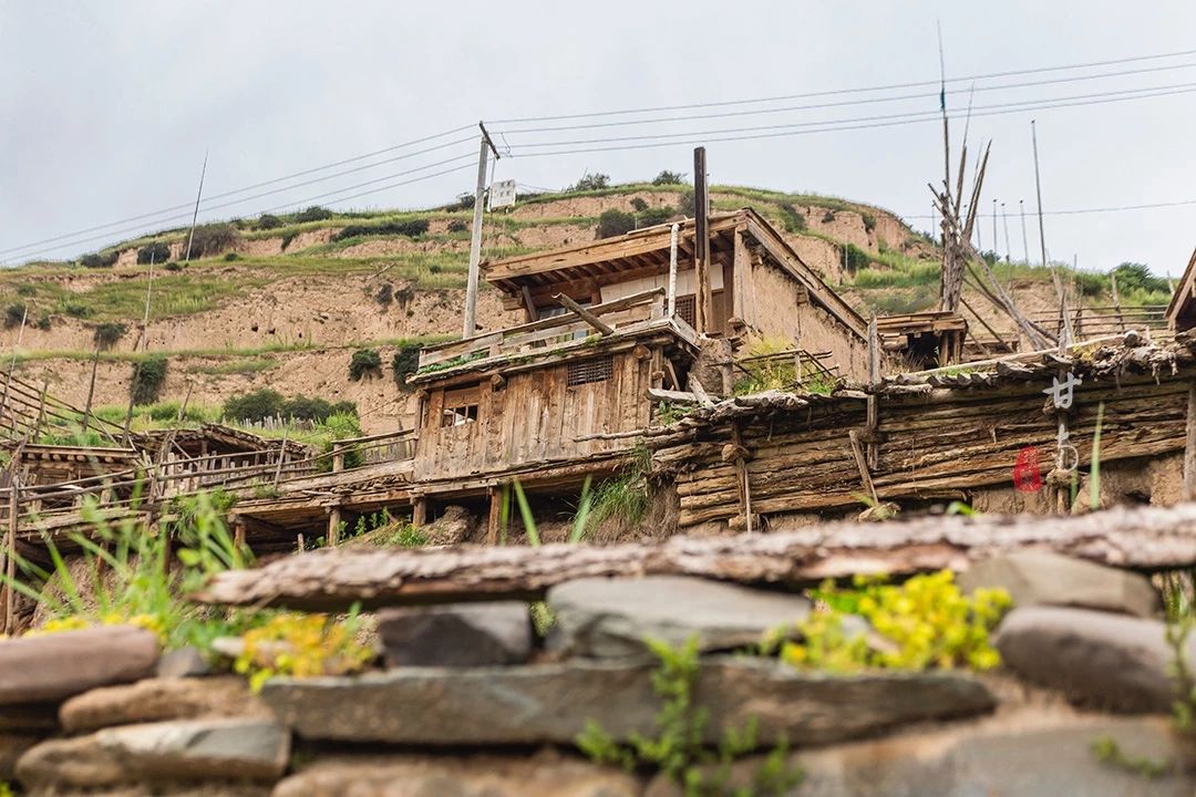 晴空之下,圆木搭起的架杆密如蛛网,纵横交错,将村寨包裹得更加神秘了几分。