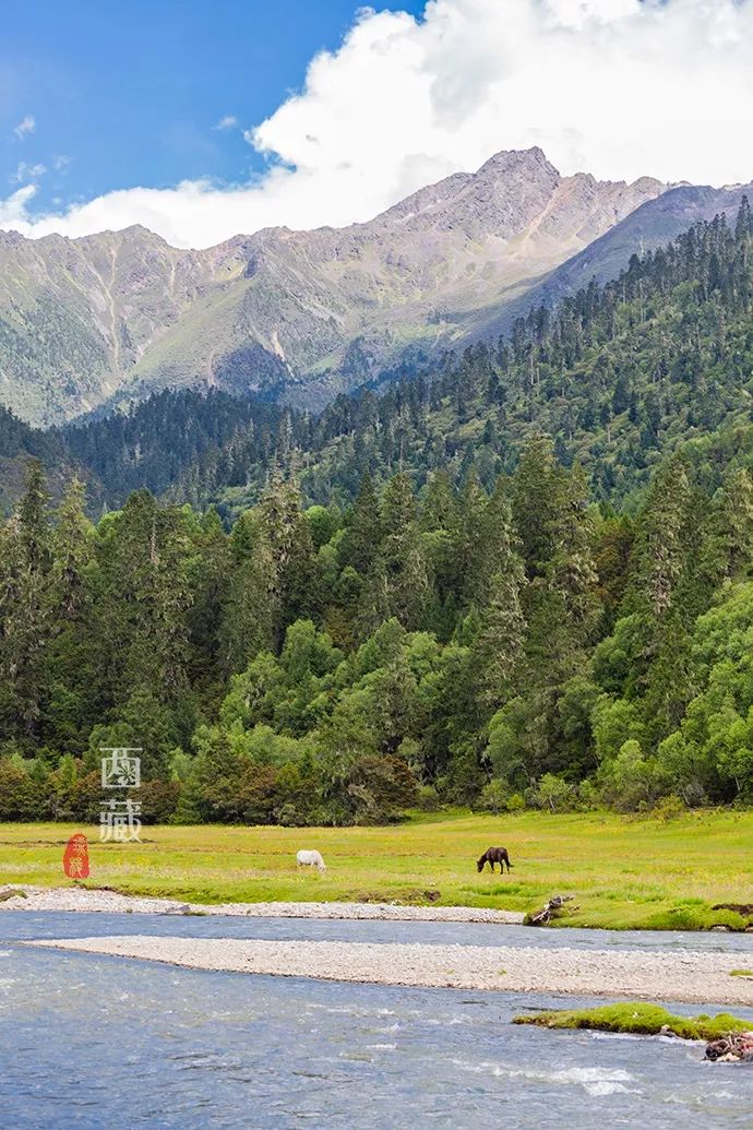 两侧青山由低往高,分别由灌木丛和茂密的云杉、松树组成了“鲁朗林海”。正所谓“幼林葱翠母林幽”,绿得丰富的林海是鲁朗最美的风景线。