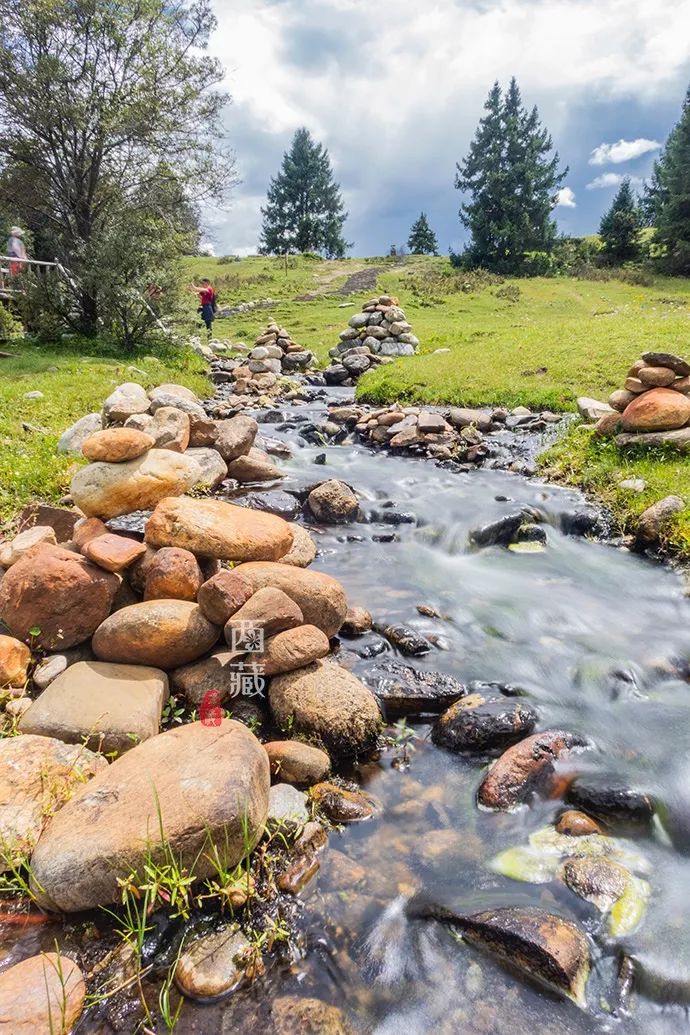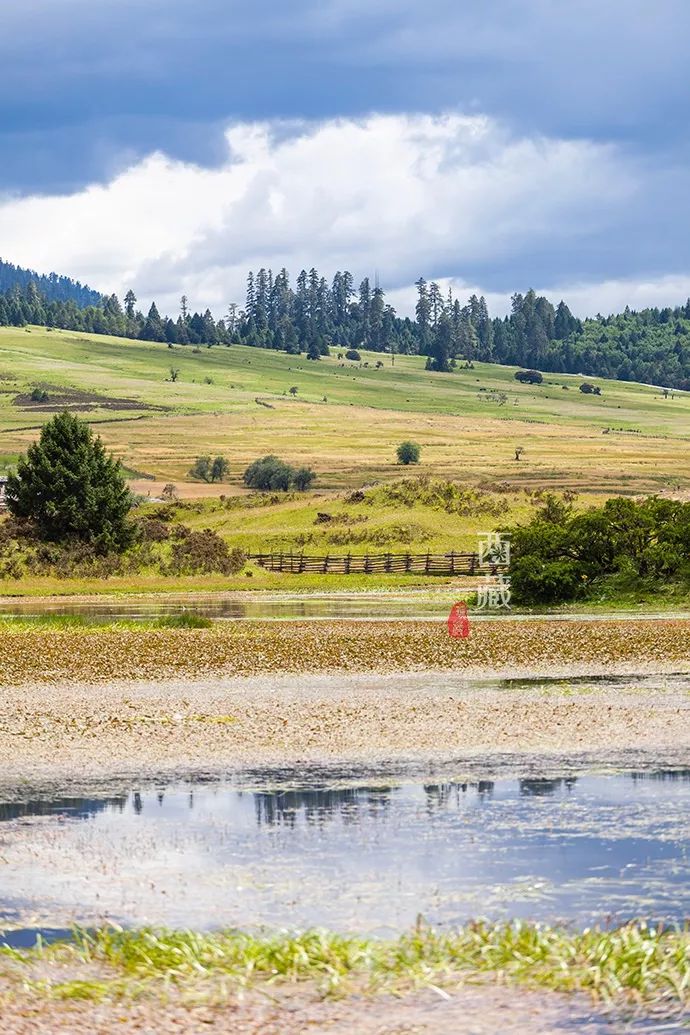 这里的年平均气温12,在高原温带半湿润季风气候的影响下,植被茂密生长,一年四季风景宜人。整片整齐如人工修剪的绿色草甸之上,一条溪流蜿蜒而去。微风拂过,水面皱起,给宁静的画面增添了一丝动感。