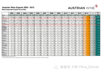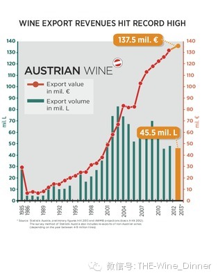 回首2013,奧地利葡萄酒釀酒商把這一年看成又一個成功的出口年。像2012 年一樣,雖然去年的收成也低於平均水平,但是出口收入增長了4% 而達到了1.375 億歐元。同時,由於瓶裝酒的出口份額增加,葡萄酒出口的平均價格第一次達到了3 歐元/升。另外,國內葡萄酒經濟結構的優化,令從事葡萄酒出口公司的數量不斷增加。特別是對比荷盧、斯堪的納維亞國家、英國,以及海外市場包括日本和中國的出口,為取得這一歷史新高貢獻得最多。