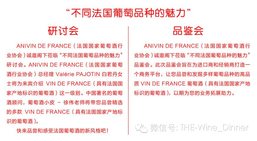 由法國ANIVIN DE FRANCE(法國國家葡萄酒行業協會)主辦的《不同法國葡萄品種的魅力研討會/品鑑會》(The Glamorous French Grape Varieties Trade Event/Seminar) 探索法國普羅旺斯葡萄酒活動分別在青島、重慶和武漢舉行。