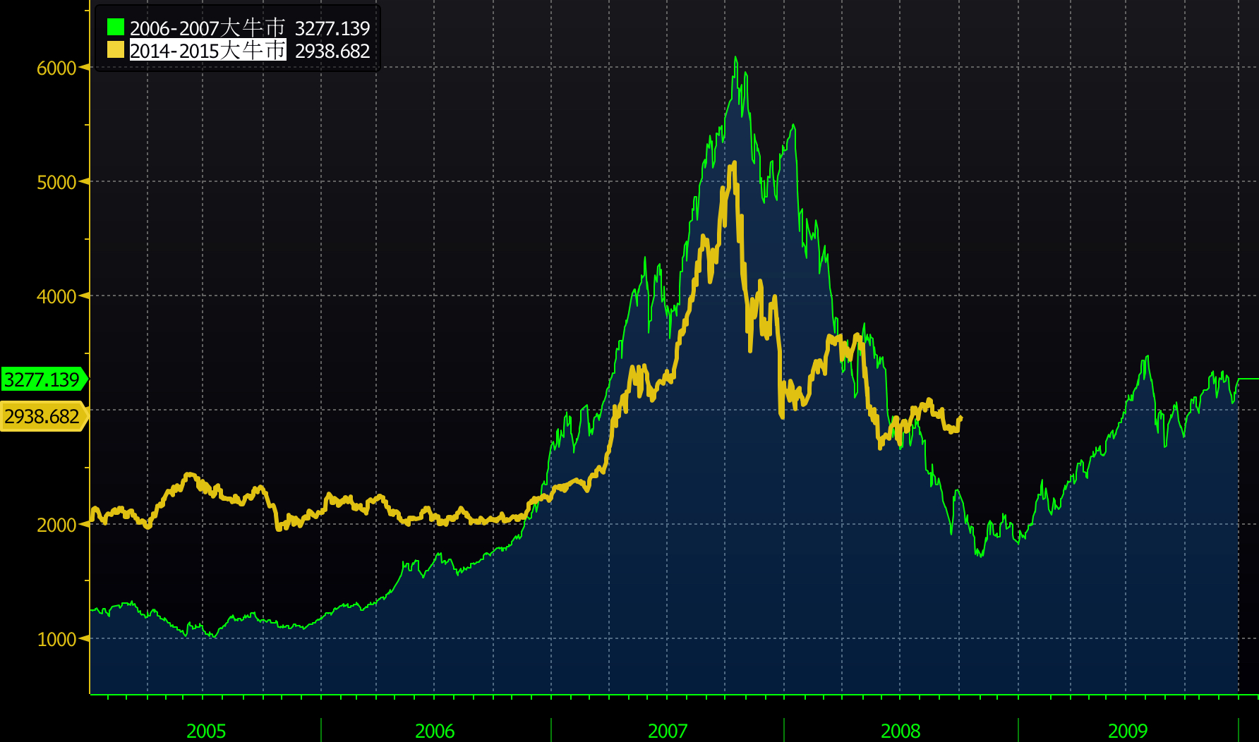 有人把07年牛市和当时走势做对比,甚至有把郁金香泡沫的图拿来重叠对比的。这种做法看似有理,但没有任何依据。两幅图叠加,有两个X轴和Y轴,平移、缩放、拉升的处理空间是很大的。任何一波牛熊都是可以通过这种方式大致重叠的,这不过是种错觉。