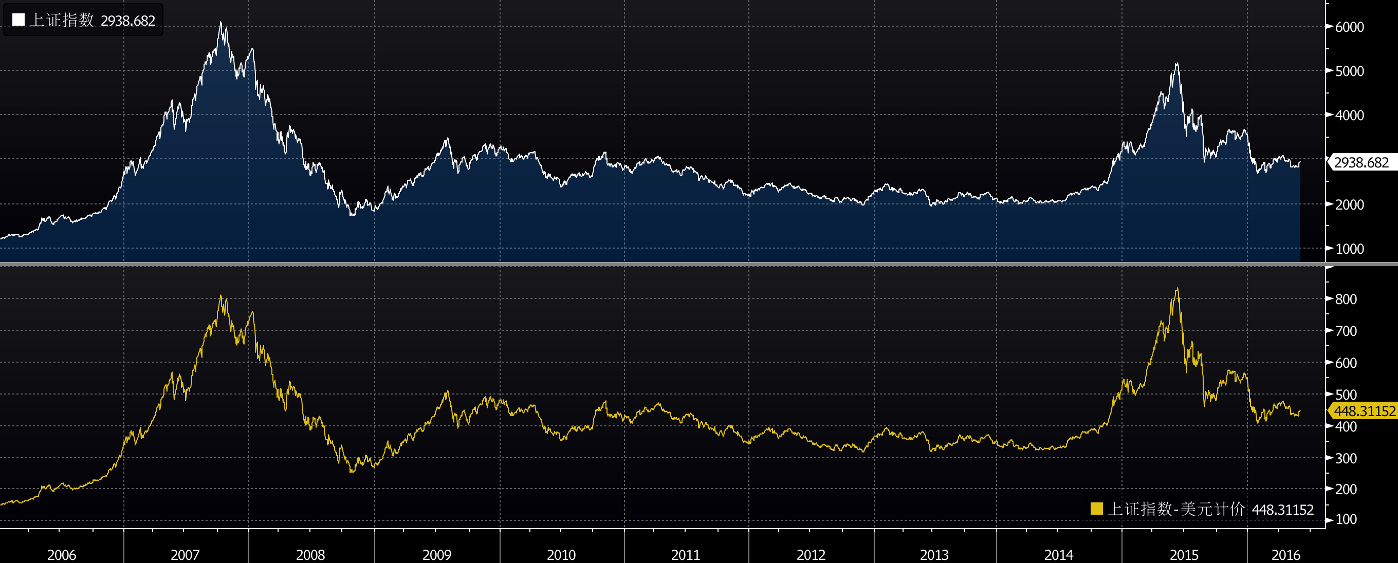 我多次用过一种方式,在可能处于拐点的大宗商品上采用本币和美元两种图形比较。这种方法多次给我重要参考,曾经在2012年做多豆粕过程中顺利高位出清并捕捉到了顶部做空的机会。去年5月开始,我关注到以美元计价的上证指数正在接近历史记录,并在5月15日这天超过了2007年的最高点。然而处于牛市狂热中的我,全然不为所动。