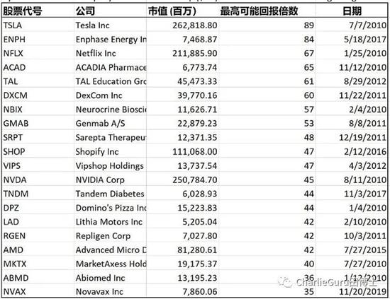 特斯拉在过去10年中排第一。第二个是一家我从来没听说过的公司,是做跟太阳能有关的东西。第三家奈飞在二十年中也是排名第三。