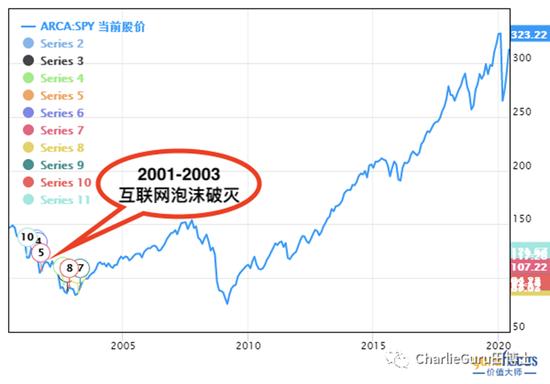 我把牛股前几名的买入时间标在了美国大势标普500的曲线上,大家可以看看。这些公司的最佳买入时间几乎都是在大熊市之后。