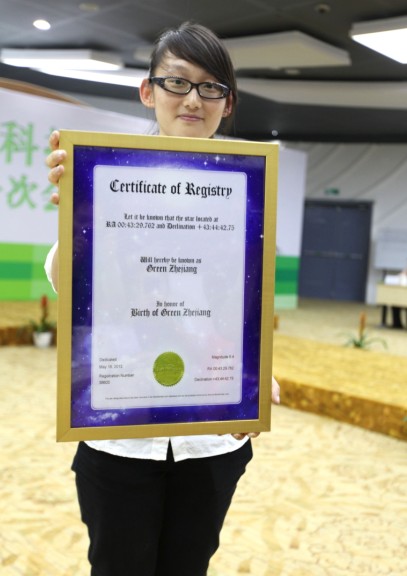 成立大会最大的亮点就是宣布“绿色浙江”星。据大会主持人、新聘绿色浙江公益大使许诺介绍,为纪念绿色浙江十三年终获成立,协会通过美国航空航天局(NASA)获得太空中一颗星星的命名,并在今天正式命名为“Green Zhejiang”(“绿色浙江”)。据了解,绿色浙江星伸缩坐标系为RA: 00:43:29.762,倾斜角为+43:44:42.75,重量级为8.4。从这一天起,这颗名为“Green Zhejiang”(绿色浙江)的星星将会在天空中指引这协会这只“无脚鸟”飞翔的方向,在黑暗的夜晚照明它前进的方向。