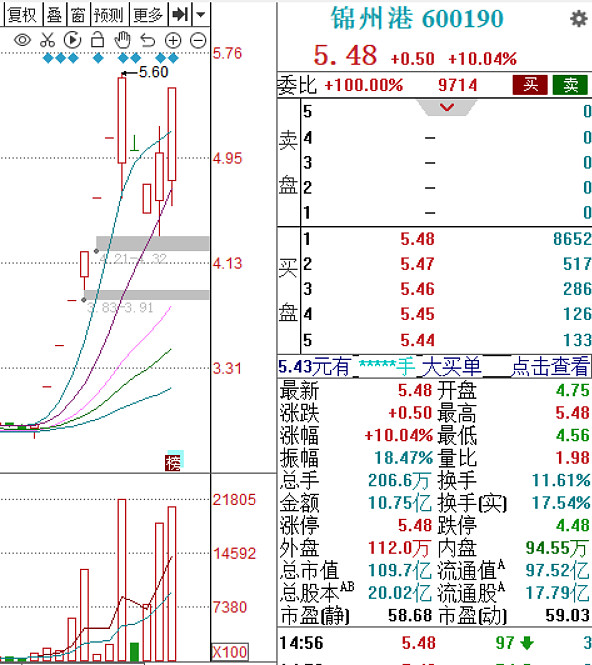 高弹性,锦州港,前面有个六连板,股性激活,量能瞬间放大。