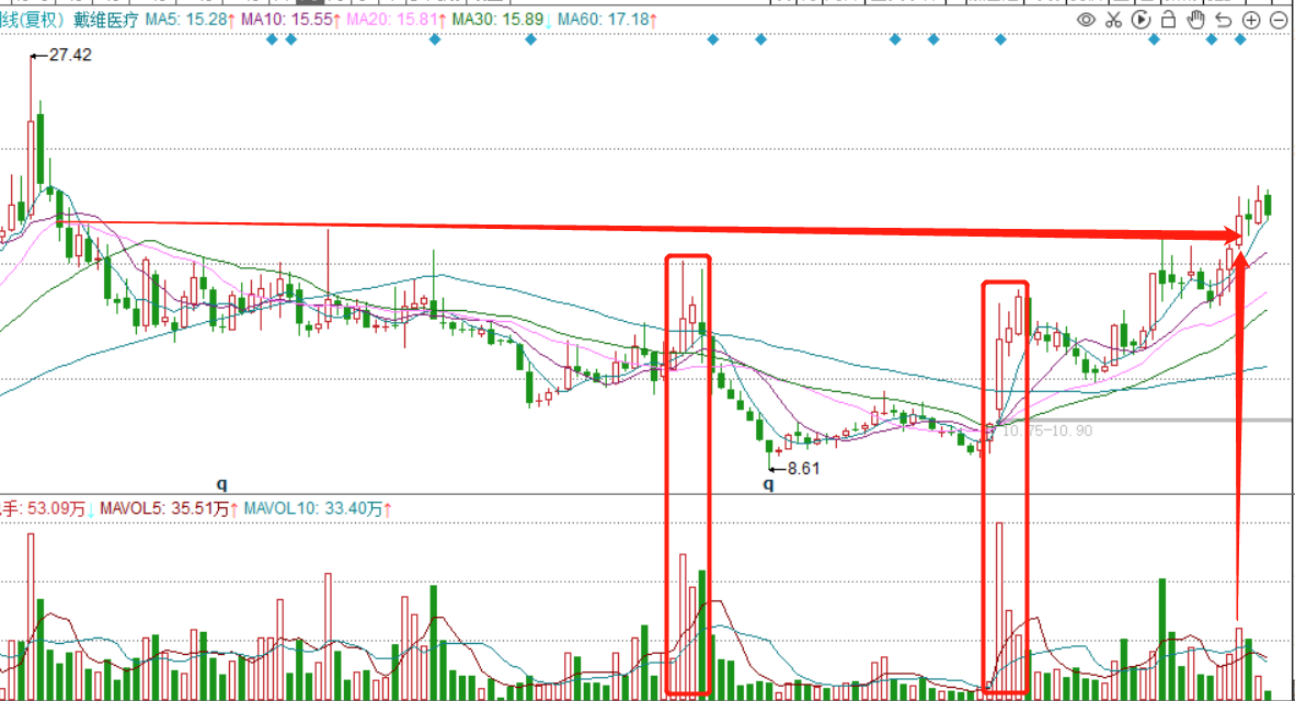 量价配合良好,杯柄买入点在4月27日那周。现在还好,有点晚,但并不远。