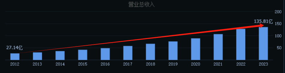 营收,从2012年到2023年连续增长,去年已达136亿元。