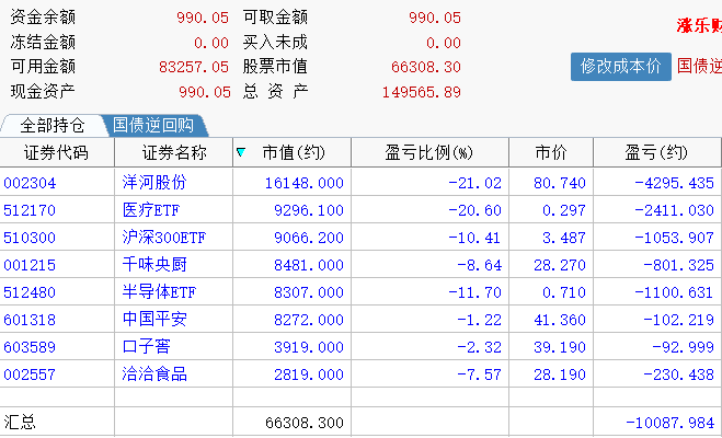 仓位由大到小:洋河股份、医疗ETF、沪深300ETF、千味央厨、半导体ETF、中国平安、口子窖、恰恰食品。