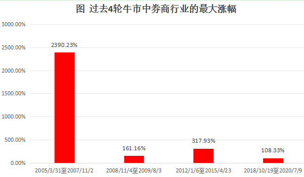 券商行业被认为是牛市旗手,那么从牛市看,过往牛市中最好的表现有多大呢?这里做一个回测。牛市中券商行业的表现