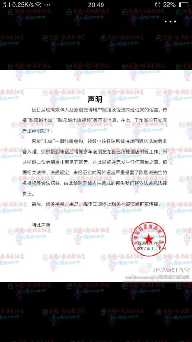 据“关八”网友爆料,疑似陈思诚工作室在当天晚上,新注册了个名为“陈思诚工作室”的微博,对出轨门一事发表了声明。但随后不久又将该声明删除,据爆料网友推测,删文原因或许是发现声明漏洞太大。