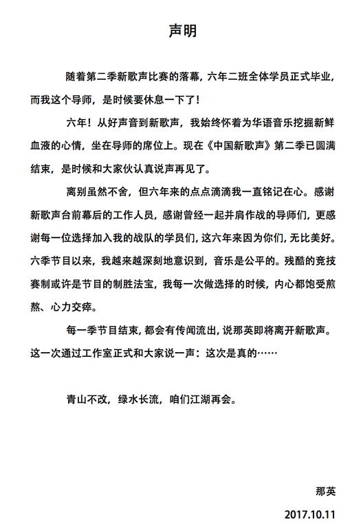 2017 年 10 月 11 日,那英工作室发表声明,宣布将不再参与后续《中国新歌声》节目录制,就在“六年二班,正式毕业”之际,宣告并纪念六年导师身份的完结。