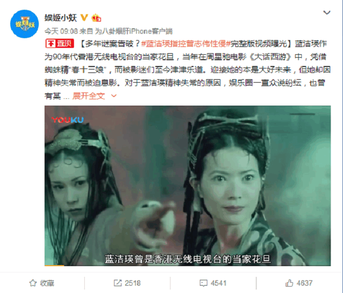昨天卓伟就爆料说谜案告破,今天上午九点的时候,卓伟就放出了一段蓝洁瑛指控曾志伟性侵的完整视频。大家都知道,早年蓝洁瑛因为出演了“蜘蛛精”春十三娘大火了一把,正当大家都认为蓝洁瑛前途一片光明的时候,却又因为“精神失常”而不得已退出了娱乐圈。