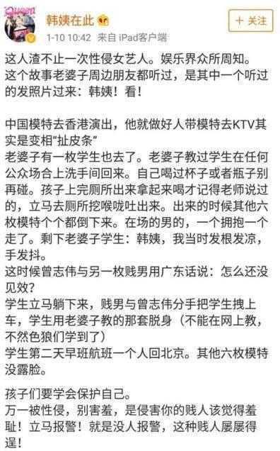 而曹颖华如今已经这般岁数,显然不会无端去污蔑或者冤枉影坛的大佬级人物。而曾志伟这次事件,想必不是空穴来风。下边就静等曾志伟给所有人一个说法。