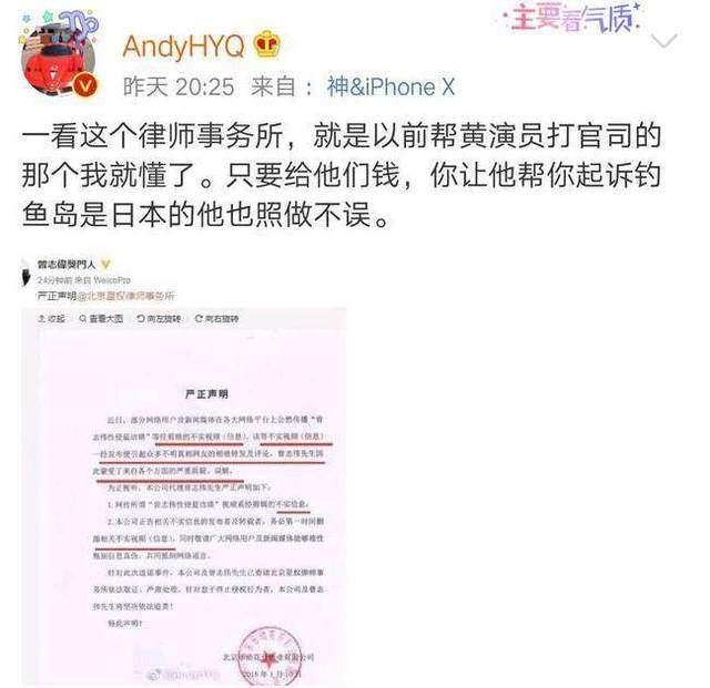 黄毅清带节奏的功夫的确一流,从李小璐、皮几万到马苏、张继科、周冬雨、曾志伟,黄毅清DISS了一圈,但也有专拣软柿子捏的嫌疑,在曾志伟发了声明之后,黄毅清也怼了替曾志伟发声明的律师事务所,妄图把火烧到曾志伟那里,也许是掂了掂自己的斤两,黄毅清随后就删了该微博!