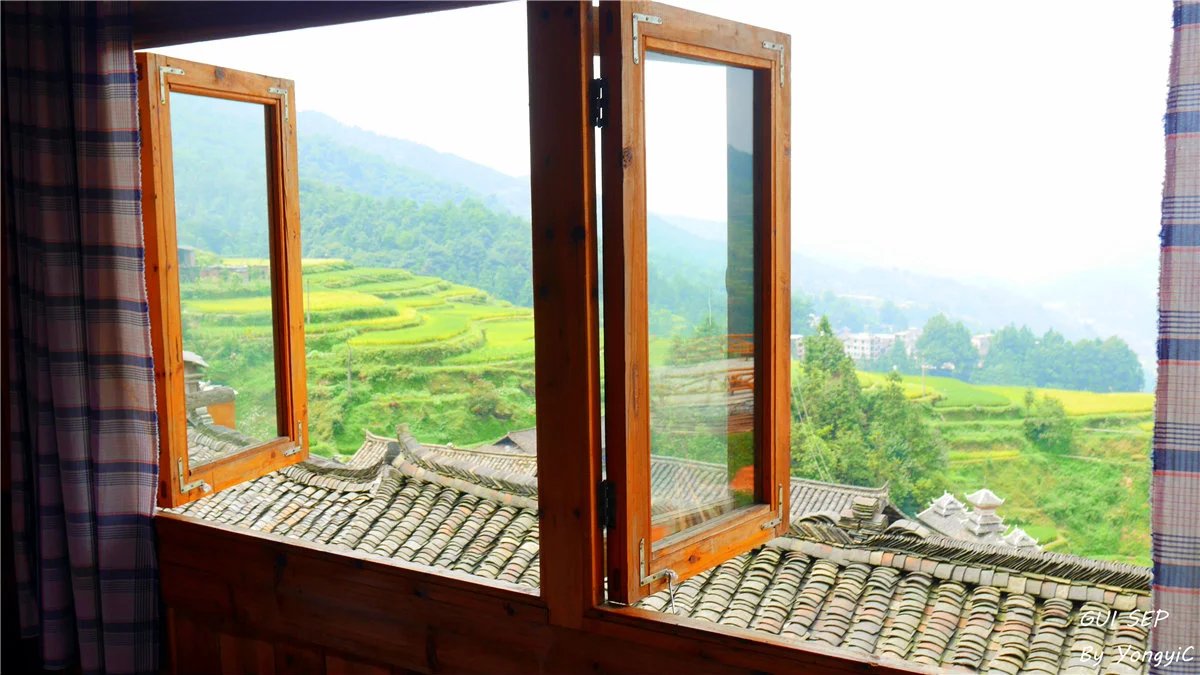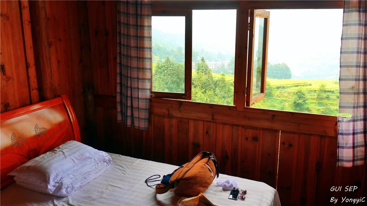 进到我们的房间,一打开窗满眼都是黄绿相间的梯田,虽然房间没有空调,但是有风也挺凉爽的,就是房间是对着西面,太阳下山那段时间可热了,热到我们坐着都会出汗,也有优点,就是能直接坐在床上看日落。我们来的这两天虽说太阳高照,就是几天没有雨导致空气不太清晰,看不太清整个梯田的样子。