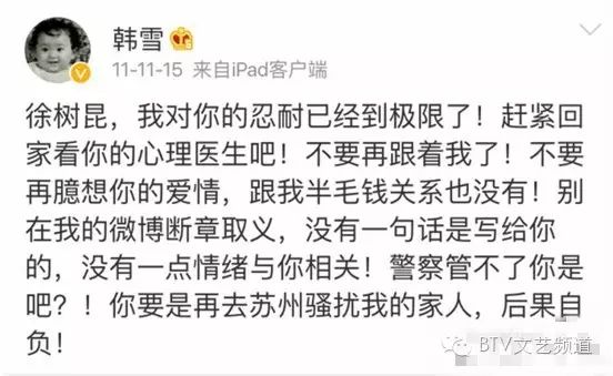 以前韩雪也发微博声讨过,一名中年男子,对她进行了长达两年的骚扰......