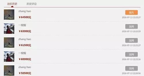 该作品以0元无底价起拍,共有十余位买家出价,首位买家出价3000元,加价幅度为1500元,此次竞拍达41次,最终该作品以6.45万元成交,由网友“zhang