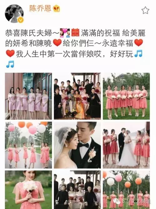 前几天,陈晓、陈妍希在北京举办了婚礼,陈乔恩和阿娇都是最美伴娘团的一员。婚礼结束后,第一次当伴娘的陈乔恩还发了祝福微博↓