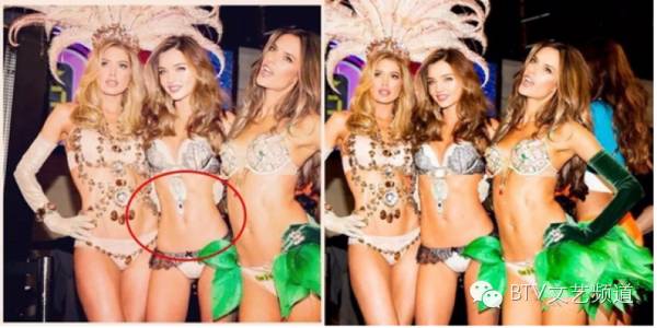 还有另一位维密天使米兰达可儿,她著名的“小蛮腰事件”,为了自己纤腰,愣是把身边俩妹纸的腰P出了孕态。