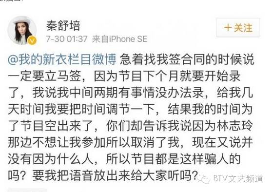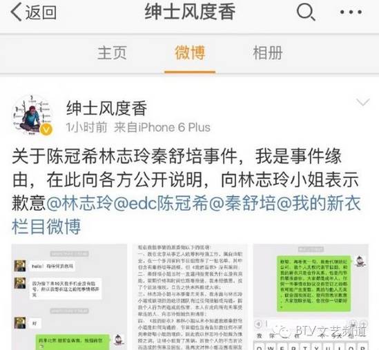 然而令人没想到的是,一个微博名叫@绅士风度香,也就是跟秦舒培语音的代理经纪人,却在昨天下午突然跑出来认错,意思就是节目组不用秦舒培,秦舒培一直在逼问指责他节目组为啥不用自己。他就拿林志玲当理由推脱,但没想到秦舒培认真了....