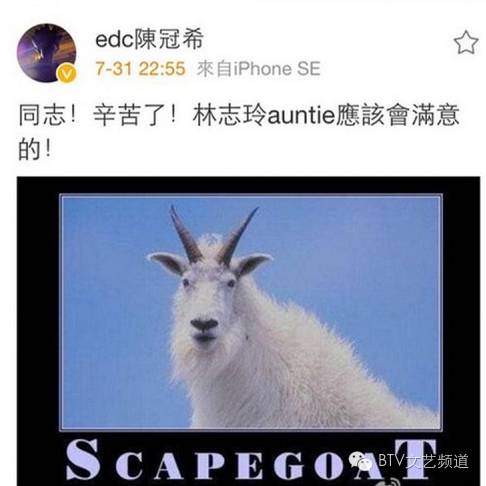 没想到随后晚间,陈冠希突然发了条微博称:“同志!辛苦了!林志玲auntie应该会满意的!”文中配的图片上有一只羊,下面的英文是“scapegoat”,翻译过来为“替罪羔羊”。意思就是他觉得林志玲找了代理经纪人来挡枪....