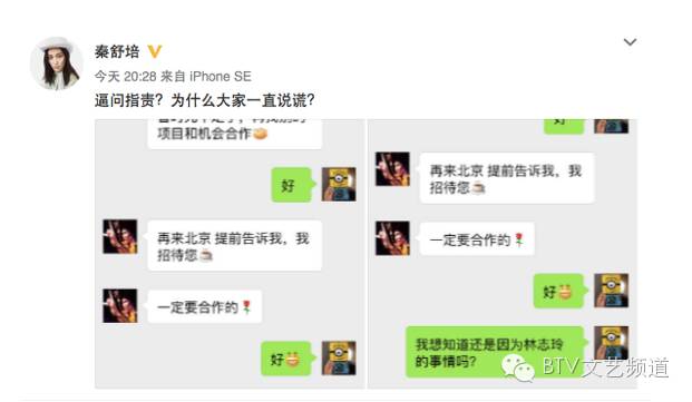 但是秦舒培依然不依不饶,紧跟着又在微博放出两张微信聊天截图,澄清自己并没有“逼问指责”,指责对方在说谎。