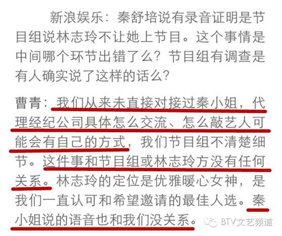 不过节目组制片人接受媒体采访时,否认此事与林志玲有关。称林志玲从未提过不想与任何人同台的要求,还称节目组从未直接和秦舒培方接触,是通过代理经纪公司联系艺人,而秦舒培说的语音跟节目组没关系,但他们也会扛起责任,搞清楚整件事情。