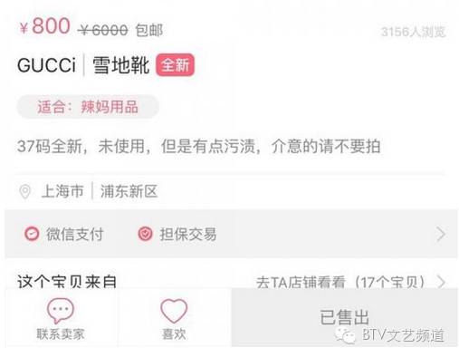 其中一款GUCCI雪地靴她卖800元,上边写的特别仔细,“全新有污渍,介意的不要拍”,不过同时也暴露了娘娘的脚码——37。
