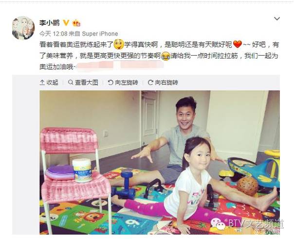 近日,李小鹏晒出奥莉的一字马照,并发文称:“看着看着奥运就练起来了,学得真快啊,是聪明还是有天赋好呢~~ 好吧,有了美味营养,就是更高更快更强的节奏啊请给我一点时间拉拉筋,我们一起为奥运加油哦。”