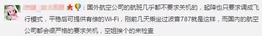 但也有人帮忙澄清:“没看见是飞航模式WIFI吗?为啥有些网友就在意这些细节,我真是醉了!”、“就中国要关机,国际航班不仅不用关、有的还提供WIFI呢!”