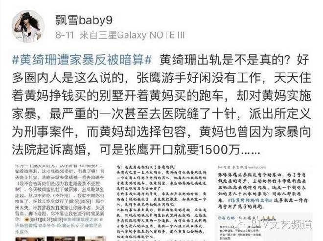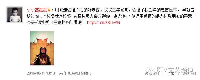 另一边,黄绮珊昔日的工作人员也站出来为她说话,其发表微博称:“时间是验证人心的好东西,仅仅三年光阴,验证了我当年的忠言逆耳,早就告诉过你,垃圾就是垃圾,选择垃圾人会弄得你一身恶臭,你却用愚顿的眼光排斥朋友的善意。今天请接受自己选择的结果吧!”疑指黄绮珊三年前与现任丈夫张鹰的结合一事。