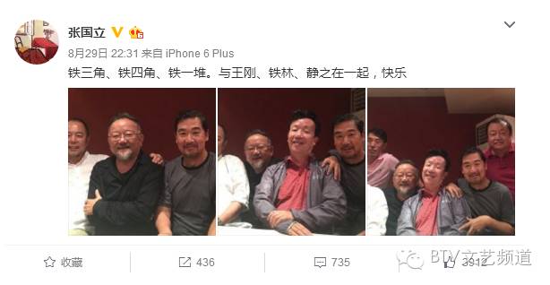 昨天晚间,演员张国立在微博晒出几张与王刚、张铁林、邹静之在一起重聚的照片,并附文:“铁三角、铁四角、铁一堆。与王刚、铁林、静之在一起,快乐。”