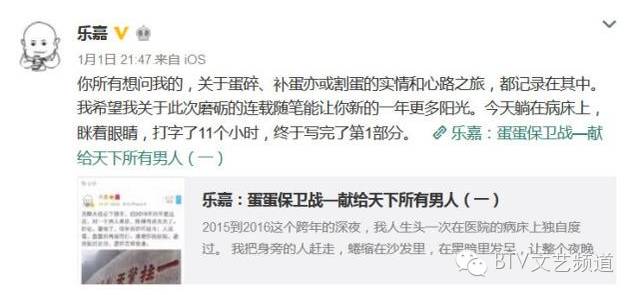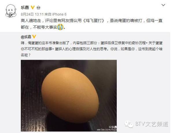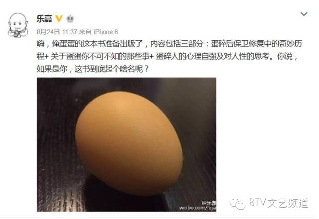 直到近日,乐嘉通过微博透露将出书写蛋碎经历,内容包括了蛋碎后修复的奇妙经历,关于蛋蛋不可不知的那些事,蛋碎人的心理自强及任性思考四个部分,并向网友征集书名。