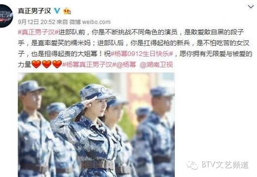 昨天晚上,该节目官方微博晒出杨幂穿军装的照片,并称:“进部队前,你是不断挑战不同角色的演员,是敢爱敢自黑的段子手,是直率爱笑的糯米妈;进部队后,你是扛得起枪的新兵,是不怕吃苦的女汉子,也是担得起责的大姐幂!祝杨幂0912生日快乐!愿你拥有无限爱与被爱的力量。”