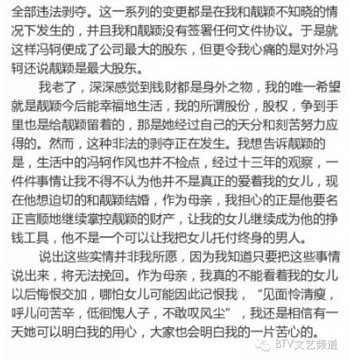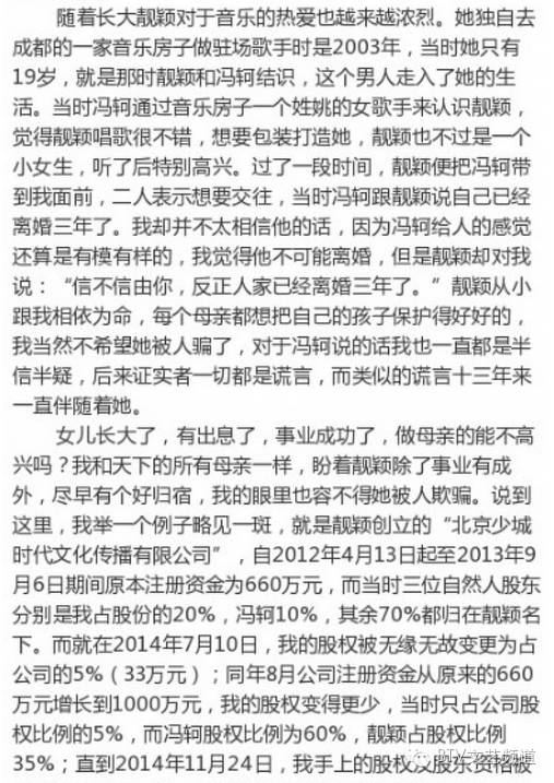在张靓颖妈妈的公开信中,她提到女儿张靓颖19岁就和冯柯认识,当时冯柯自称已离婚三年,但张靓颖妈妈却并不相信。另外,张靓颖妈妈还指出,冯柯之所以要和张靓颖结婚,可能也是想转移两人的公司财产。最后张靓颖妈妈一再强调,冯柯的非法剥夺行为还在发生,生活中的冯轲作风也并不检点,现在他想迫切的和靓颖结婚,可能是要名正言顺地继续掌控张靓颖的财产,让张靓颖成为他的挣钱工具。