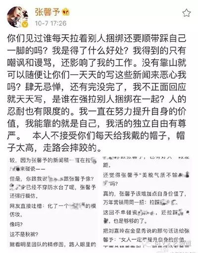 对此,近日张馨予在微博上发文否认捆绑炒作:“你们见过谁每天拉着别人捆绑还要顺带踩自己一脚的吗”、“本人不接受你们每天给我戴的帽子,帽子太高,走路会摔跤的”。