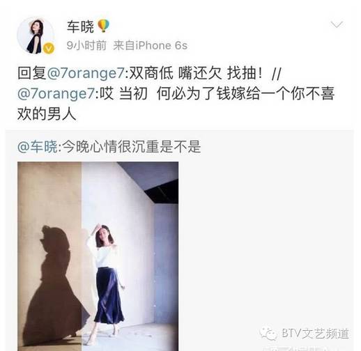 昨天,女星车晓在微博表示“今晚心情很沉重是不是”,并配上一张行走的照片,结果一位网友评论:“当初何必为了钱嫁给一个你不喜欢的男人?”也许心情是真的不好,车晓看到这条评论立马就怒了,她转发这条评论并回击:“双商低,嘴还欠,找抽!”