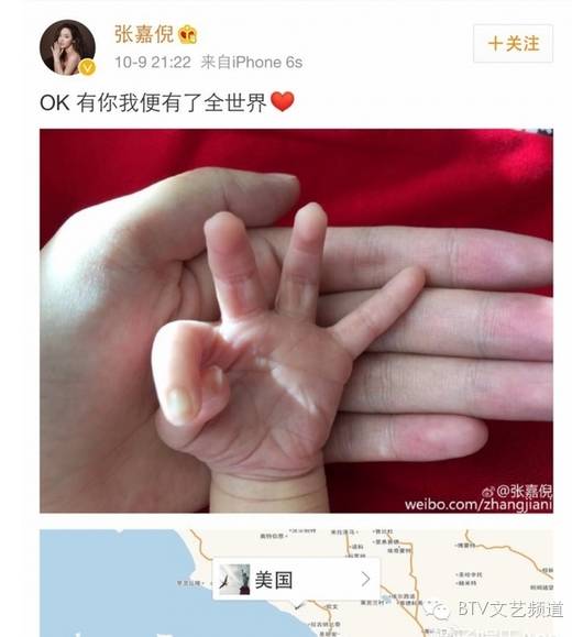 去年,张嘉倪被圈外男友买超求婚成功,两人表示有望于今年举办婚礼。但没想到,比婚礼先来一步的,则是两人爱情的结晶。昨晚,张嘉倪在微博上晒出一张照片,照片中一个小婴儿的手摆出“OK”的手势,静静地躺在一双大手中。张嘉倪写道:“OK,有你我便有了全世界。”