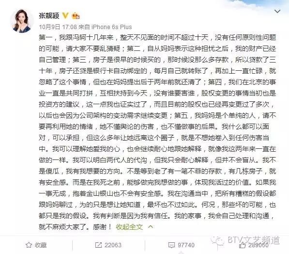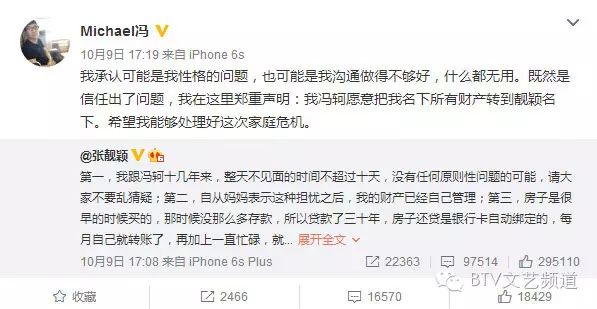 冯轲先是发表了声明解释,后来还转发了靓颖的回应并写道:“承认可能是我性格的问题,也可能是我沟通做得不够好,什么都无用。既然是信任出了问题,我在这里郑重声明:我冯轲愿意把我名下所有财产转到靓颖名下。希望我能够处理好这次家庭危机。”