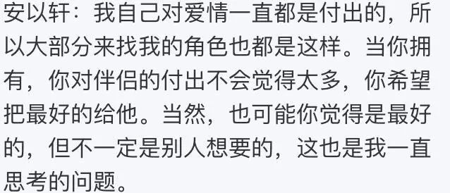 安以轩曾表示:自己也明白掏心掏肺并不能换来真心相待。其实女人遇到爱情,容易盲目付出一切,但是你最后只是把自己给感动了而已。