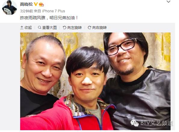 随后,高晓松晒出和王宝强的合影,并附文称“昨夜雨疏风骤,明日兄弟加油!”