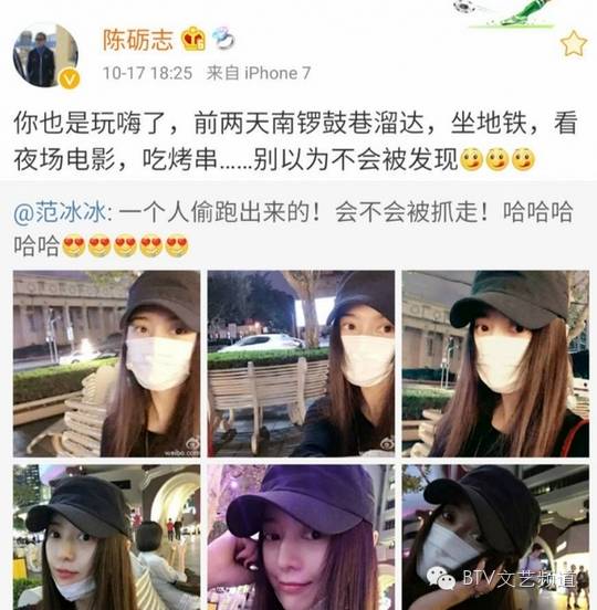 其实范冰冰不止昨天偷跑出去了,前两天她朋友还在微博爆料,范冰冰在北京的南锣鼓巷溜达,不但坐地铁、看夜场电影,还吃烤串!也真是玩嗨了~~