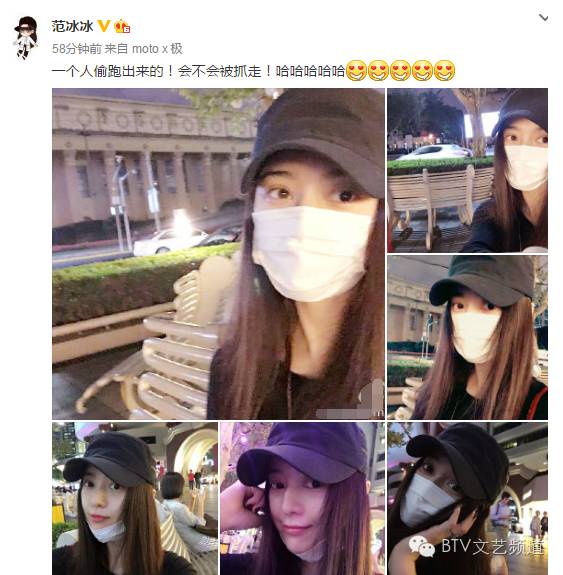 近日,范冰冰在微博晒出一组自拍,透露自己一个人偷跑出门,还偷偷的和路人合照了。