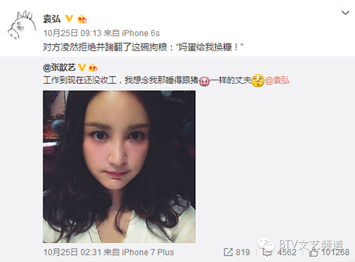 昨日,张歆艺在微博上晒出自己的自拍照,并示爱袁弘,表示很想念自己那个“睡得跟猪一样的丈夫”。面对老婆大人给予的“嘉奖”,袁弘表示“对方凌然拒绝并踹翻了这碗狗粮”,并称:“妈蛋给我换糠!”。