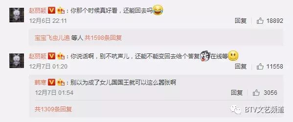 赵丽颖调皮地在评论区连发两条评论:“你那个时候真好看,还能回去吗?”、“你说话啊,别不吭声儿,还能不能变回去给个答复,在线等。”赵小刀的穷追猛打之势,让作家韩寒都招架不住,只能弱弱地回复道:“别以为成了女儿国国王就可以这么嚣张啊。”