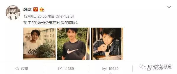 12月6日晚,韩寒在微博上晒出了自己的旧照,并写道:“初中的我已经走在时尚的前沿。”